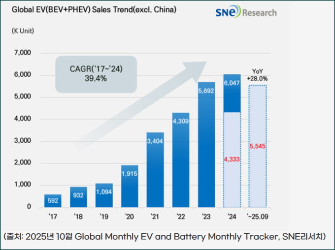 ![2025년 1~9월 중국을 제외한 세계 각국에 차량 등록된 전기차 총 대수는 약 554.5만대로 전년 동기 대비 28.0% 증가한 것으로 나타났다. [자료= SNE리서치]](http://www.biznews.or.kr/data/photos/20251145/art_17624820681019_e8220c.png)