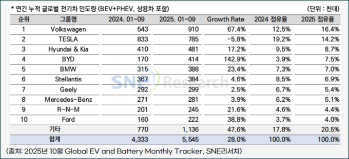 ![글로벌 전기차 인도량에서 폭스바겐 그룹은 전년 동기 대비 67.4% 증가한 91.0만 대를 판매하며 테슬라를 제치고 1위에 올랐다. [자료= SNE리서치]](http://www.biznews.or.kr/data/photos/20251145/art_17624821515491_79572c.png)