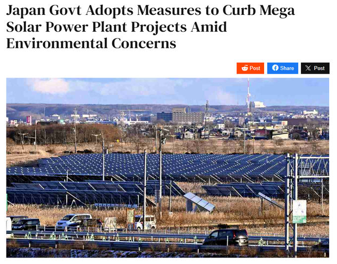 25일, 일본 요미우리신문이 운영하는 영자신문 재팬뉴스(The Japan News)는 일본 정부가 메가 솔라 발전소 개발로 인한 환경 훼손과 재해 위험에 대한 우려를 해소하기 위해 약 20개의 규제 방안을 담은 패키지를 채택했다고 보도했다.