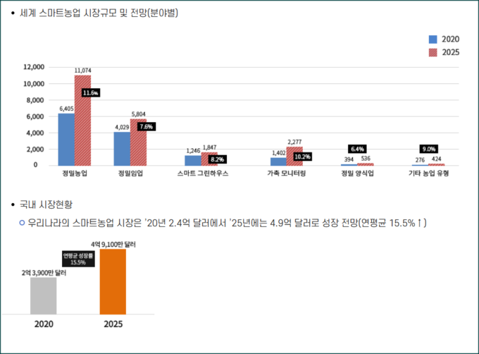 국제 시장에서도 스마트팜은 빠르게 성장하고 있다. 글로벌 시장조사기관 마켓앤마켓(MarketsandMarkets)이 2024년 12월 발표한 보고서에 따르면, 세계 스마트농업 시장 규모는 2020년 138억 달러에서 2025년 220억 달러로 확대될 전망이다. 연평균 성장률은 9.8%에 달하며, 특히 정밀농업 분야는 2025년까지 110억 달러 이상 규모를 형성할 것으로 예상된다. 이는 ICT, 빅데이터, 로봇 자동화, 블록체인 유통관리 등 첨단 기술이 농업에 본격적으로 결합하면서 나타나는 변화다.