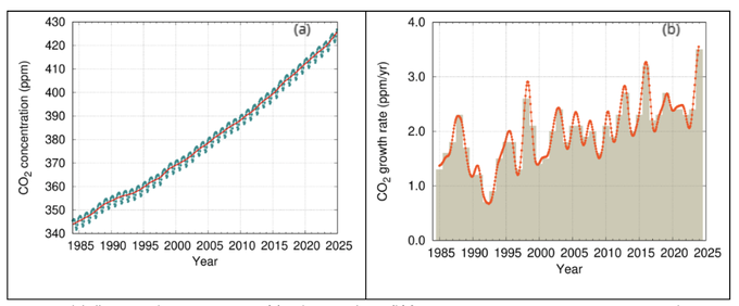 이산화탄소 외에도 메탄(CH₄)과 아산화질소(N₂O) 농도 역시 사상 최고치를 기록했다. 메탄은 2024년 평균 농도가 1942ppb로, 산업화 이전보다 166% 증가했으며, 아산화질소는 338.0ppb로 25% 증가한 것으로 나타났다.
