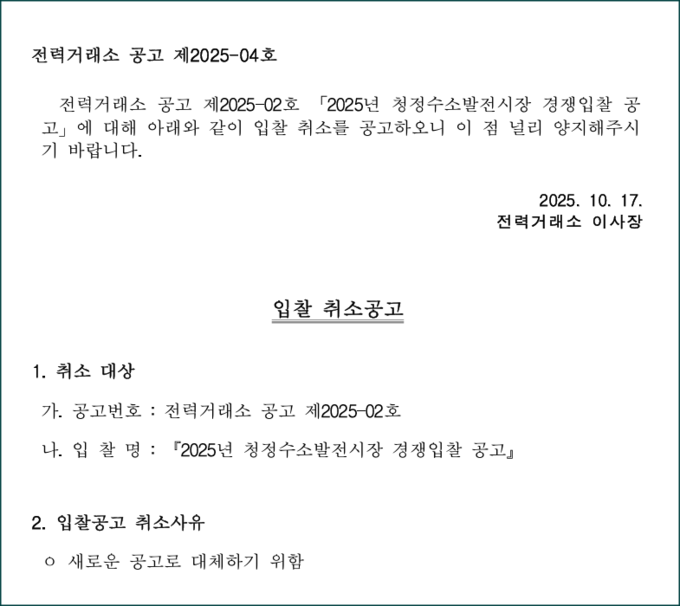 [산업경제뉴스 손영남 기자] 정부가 2025년 청정수소발전시장(CHPS) 경쟁입찰을 마감일 당일 전격 취소하면서 에너지 업계 전반에 충격이 확산되고 있다. 한국전력거래소는 지난 17일 “새로운 공고로 대체하기 위함”이라는 이유를 들어 입찰을 취소했지만, 업계는 이를 사실상 ‘암모니아 혼소 발전 배제’라는 정책 전환의 신호로 받아들이고 있다. 이러한 해석은 최근 정부의 에너지 정책 방향과 맞물려 더욱 설득력을 얻고 있다.