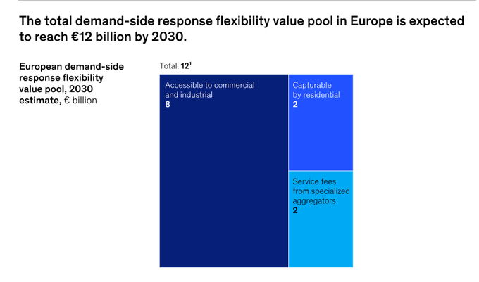 맥킨지가 10월 16일 발표한 ‘Global Energy Perspective 2025’ 보고서에 따르면, 유럽의 에너지 유연성 시장은 2030년까지 약 120억 유로 규모로 성장할 것으로 보이며, 이 중 80억 유로는 상업 및 산업(C&I) 부문이 직접 접근 가능한 수익 기회로 평가된다. 보고서는 특히 수요 측 반응(DSR)을 가장 유망한 유연성 수단으로 꼽으며, 전체 유연성 공급의 21%가 DSR을 통해 이루어질 것으로 전망했다.