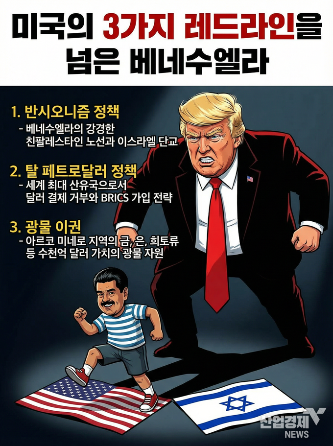 [산업경제뉴스=이상현 기자] 미국이 마약과 석유를 명분으로 베네수엘라를 군사적으로 침공, 현직 대통령 부부를 납치하고 사실상 이 나라의 주권을 강탈한 중요한 목표 3가지가 새삼 주목받고 있다. 나름 군사력을 갖춘 마두로 정권이 맥없이 무너진 건 지구촌 단극 패권의 축인 미국과 이스라엘의 마지노선을 넘었기 때문이며, 베네수엘라 내부의 협력 없이는 불가능한 작전이었다는 지적이다.