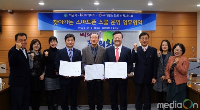 시는 지난 18일 시청 회의실에서 김성제 시장을 비롯한 ㈜KT 수도권서부고객본부 이영준 단장, (사)대한노인회 의왕시지회 김희규 부회장 등이 참석한 가운데 어르신들을 위한 ‘찾아가는 스마트폰 스쿨 운영’ 업무협약을 맺고 3월부터 본격적인 운영에 들어간다고 밝혔다.