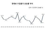 [산업경제뉴스 문성희 기자] 코로나19 확산과 함께 유가 등 국제원자재가격 상승이 국내 경제에 커다란 압박을 가하고 있다. 이러한 원자재가격 상승이 기업들의 채산성과 제품가격에 어떠한 영향을 주는지 분석한 보고서가 발표돼 재계의 관심을 모으고 있다. 한국경제연구원(이하 한경연)은 24일 '국제원자재 가격 급등이 생산자물가 및 기업채산성에 미치는 영향과 시사점 분석'이라는 보고서를 발표했다. 이 연구에 따르면 지난해 원자재가격 상승으로 생산자물가는 5.7% 상승압력을 받았고, 기업들의 영업이익률은 2.3% 포인트 감소한 것으로 분석됐다. 2021년 중 수입물가는 전년대비 17.6%나 올랐는데, 수입물가를 구성하는 항목 중 원재료수입물가의 상승률이 42.3%로 가장 높았다. 원재료수입물가의 이러한 상승률은 글로벌 금융위기가 발생한 2008년 54.6%이후 13년 만에 최대치인 것으로 조사됐다. 원재료 수입물가 상승률 추이 (단위 : 전년대비 상승률, %) 한경연은 원재료수입물가 상승이 생산자물가에 미치는 영향력을 파악하였다. 분석결과, 원재료수입물가가 1%p 올라가면 생산자물가 상승률은 0.134%p 높아지는 것으로 나타났다. 이러한 결과를 2021년 연간 기준