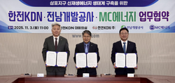 [산업경제뉴스 손영남 기자] 에너지ICT 전문 공기업 한전KDN(사장 박상형)이 전남개발공사, MC에너지와 함께 전남 영암 삼포지구를 중심으로 한 신재생에너지 생태계 구축사업을 본격 추진한다. 세 기관은 지난 11월 3일 광주전남공동혁신도시 소재 한전KDN 본사에서 ‘삼포지구 신재생에너지 생태계 구축사업 업무협약’을 체결했다고 4일 밝혔다. 이번 협약은 태양광, 바이오가스, 수소 등 다양한 재생에너지원과 디지털 기반의 에너지 관리 기술을 융합해 삼포지구를 지속 가능한 분산형 에너지 허브로 육성하는 것을 목표로 한다. 이를 통해 전남 지역의 에너지 전환을 실증하고, 전국 확산형 모델로 발전시키겠다는 구상이다. 협약에 따라 전남개발공사는 사업부지 확보와 인프라 조성, 행정 지원을 담당하며, 에너지 자립형 지역 모델 구현을 위한 기반 조성에 나선다. 또한 전남도의 분산에너지 특화지역 지정 추진과 연계해 지역이 체감할 수 있는 미래형 에너지 도시 모델로 발전시키겠다는 계획이다. MC에너지는 태양광·바이오가스·수소 등 다원적 에너지원의 융합을 담당하는 민간 협력 파트너로서, 현장관리 총괄 업무를 수행한다. 기술기업 및 학계와의 연계를 통해 지역과 함께 성장하는 상생형